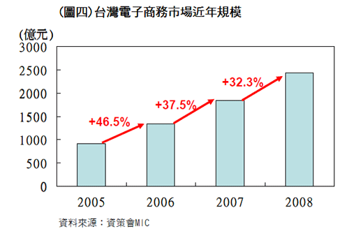 台灣的電子商務市場不斷擴大,連續三年成長率都超過三成(圖四),在2008年整體規模已達2500億元。不僅如此,各大購物網站的業績,都有顯著的成長。以Yahoo!奇摩來說,2008年線上購物的業績,逆勢成長3成,營收接近百億,規模直逼實體的百貨公司。至於和網購互相依存的物流業者,也因而受惠