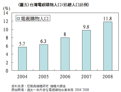 同樣具有方便、便宜特色的電視購物,消費人口也迅速地增加當中(圖五),曾在電視購物台買東西的人,從6%提升至11.8%,在五年內成長兩倍。根據《財訊》指出,在2008年,共計有167萬消費者在購物台消費,創造了368億商機。目前台灣共有7台購物頻道,而且Viva集團也預計在今年加開第二台購物頻道。由此可知,電視購物十分具有成長潛力。